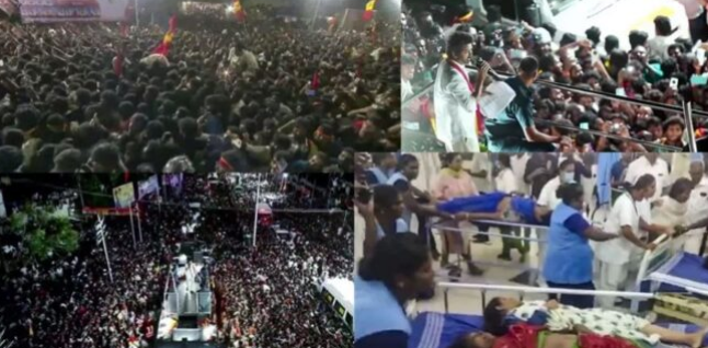 उत्तर प्रदेश के मुख्यमंत्री योगी आदित्यनाथ ने भी घटना पर दुख जताया और पीडि़तों के प्रति संवदेना जताई। उधर, सत्तारूढ़ द्रमुक ने भगदड़ को लेकर विजय पर निशाना साधा। द्रमुक प्रवक्ता सरवनन अन्नादुरई ने कहा: ”यह दिल दहला देने वाली घटना है। इसके लिए कौन जिम्मेदार है? इस रैली के आयोजक ही स्पष्ट रूप से जिम्मेदार हैं।”