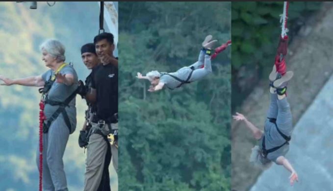 ब्रिटेन की 83 वर्षीय ओलेना बायको शिव पुरी क्षेत्र के एक बंजी जंपिंग केंद्र में बंजी जंपिंग करती हुई दिखाई दे रही हैं। उन्होंने 117 मीटर की ऊंचाई से कूद मारी।